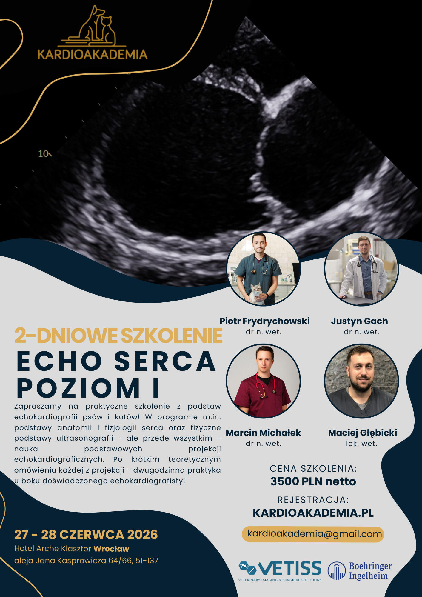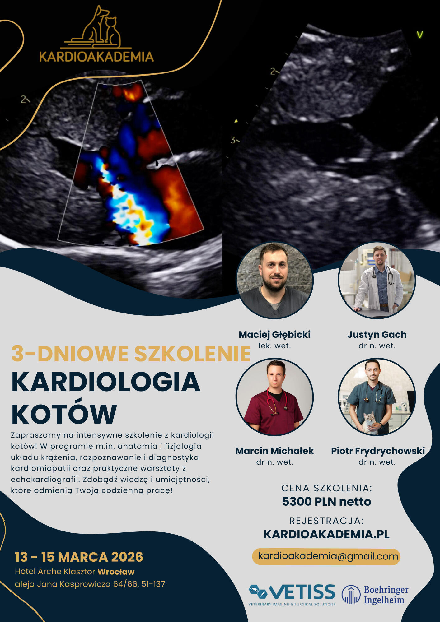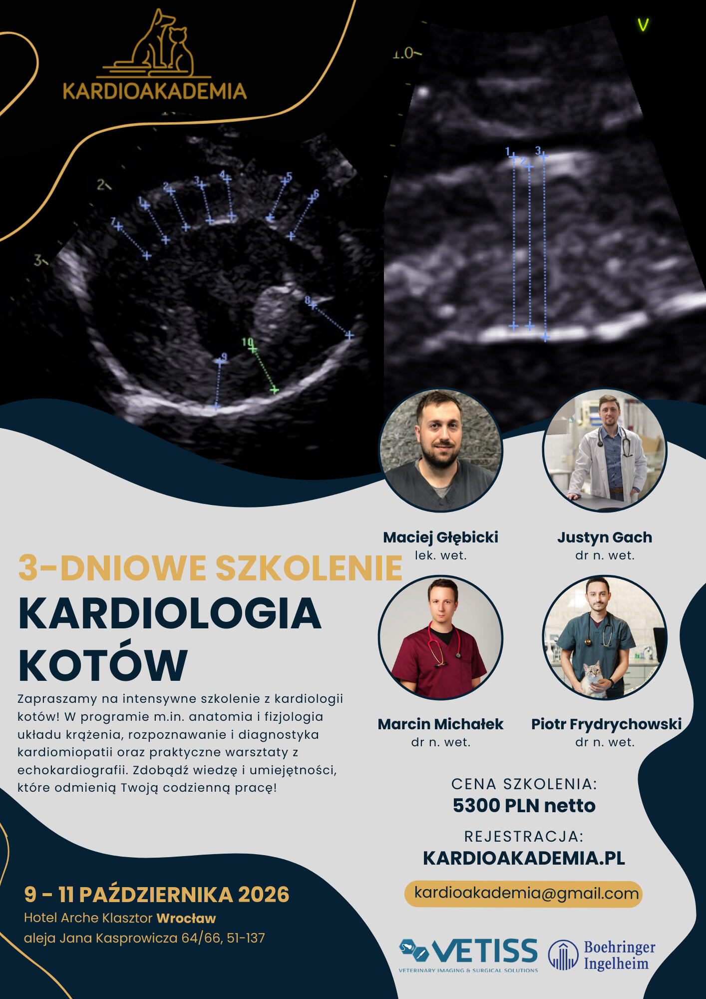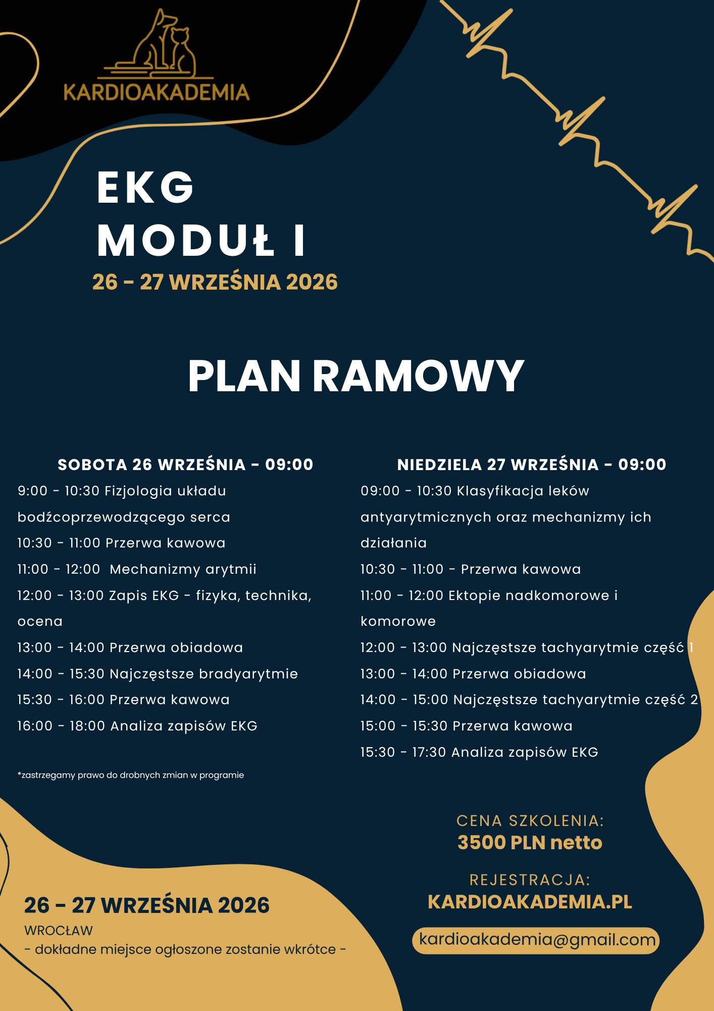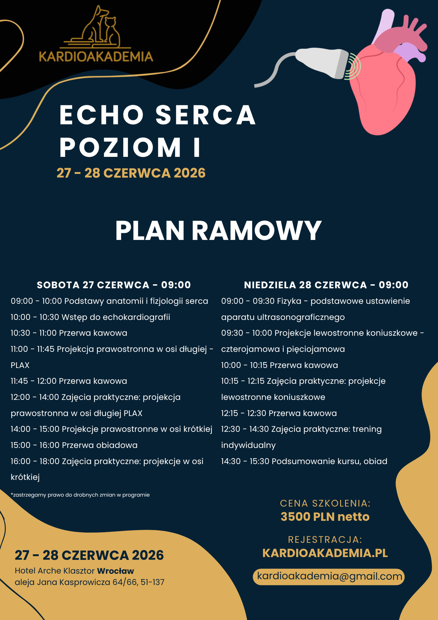 Zapraszamy na trzydniowy kurs poświęcony diagnostyce i leczeniu chorób serca u kotów. Program obejmuje zarówno podstawy anatomii, fizjologii i patofizjologii serca, jak i zaawansowane zagadnienia związane z kardiomiopatiami, niewydolnością serca, chorobą zatorowo-zakrzepową (ATE) oraz diagnostyką echokardiograficzną. Uczestnicy zapoznają się z aktualnymi metodami farmakoterapii oraz nowościami terapeutycznymi opartymi na evidence-based medicine.Innowacyjnym elementem szkolenia są ćwiczenia na stacjach pomiarowych z wykorzystaniem oprogramowania GE EchoPAC™ na udostępnionych skanach z badania kotów.UWAGA! Szkolenie praktyczne odbywa się na pacjencie leżącym na boku (nie na stojąco).