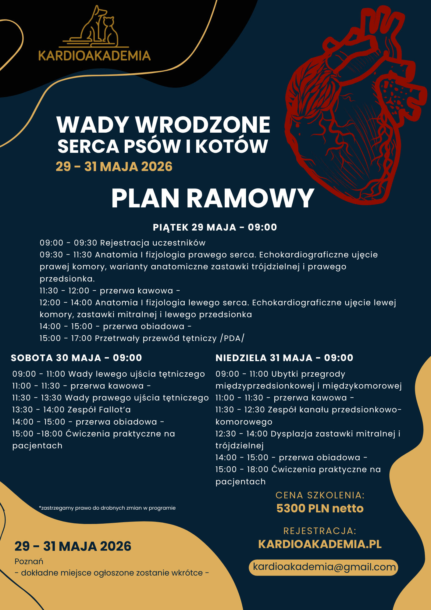 REJESTRACJA ZAMKNIĘTA - LISTA REZERWOWA- Wrodzone wady serca psów i kotów (edycja 5) - 29 - 31 maja 2026