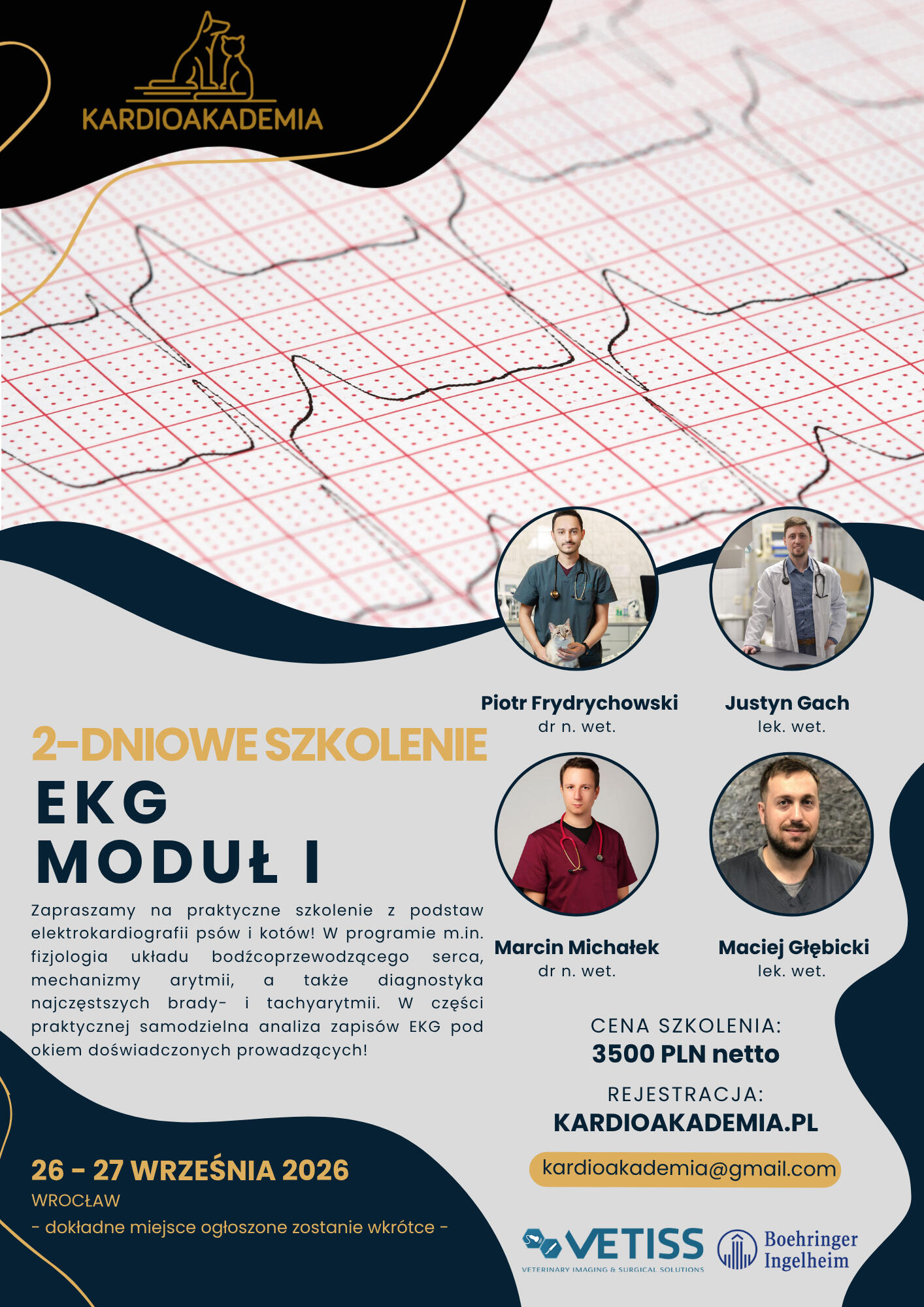 Zapraszamy na trzydniowy kurs poświęcony diagnostyce i leczeniu chorób serca u kotów. Program obejmuje zarówno podstawy anatomii, fizjologii i patofizjologii serca, jak i zaawansowane zagadnienia związane z kardiomiopatiami, niewydolnością serca, chorobą zatorowo-zakrzepową (ATE) oraz diagnostyką echokardiograficzną. Uczestnicy zapoznają się z aktualnymi metodami farmakoterapii oraz nowościami terapeutycznymi opartymi na evidence-based medicine.Innowacyjnym elementem szkolenia są ćwiczenia na stacjach pomiarowych z wykorzystaniem oprogramowania GE EchoPAC™ na udostępnionych skanach z badania kotów. Badania na części praktycznej wykonywane są na kocich pacjentach w pozycji leżącej.